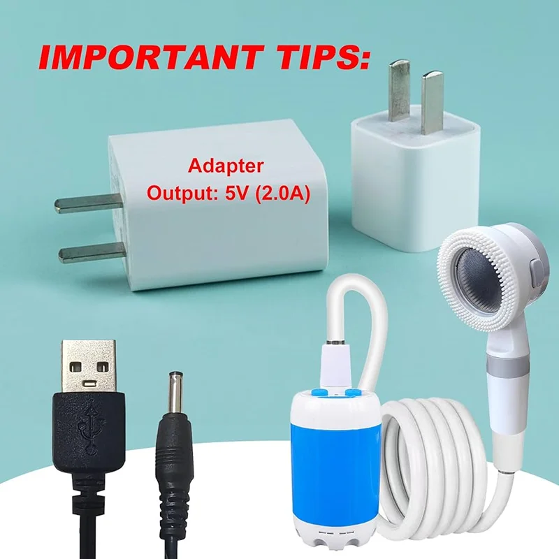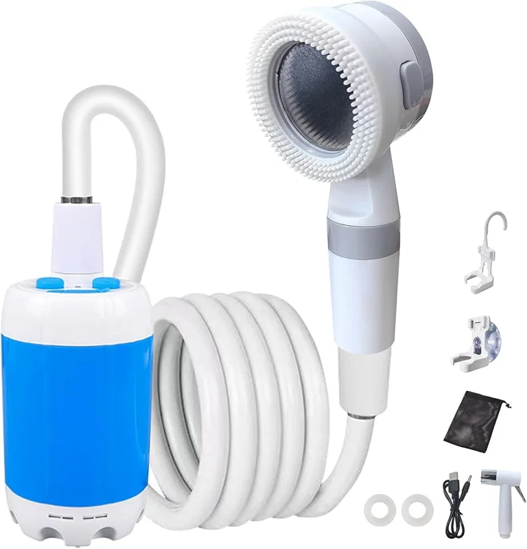 این مجموعه محصول دوش سفری ما شامل یک جا دوش، یک سر دوش، یک پمپ، یک شلنگ، یک کابل USB، یک دفترچه راهنما و یک کیسه ذخیره سازی تشکیل شده است تا نیازهای شما را برآورده فقط کافیه پمپ این دوش سفری را به طور کامل در وان سطل آب خود فرو کنید و موتور را روشن کنید، آب را از سطل به یک جریان دوش ثابت و ملایم پمپ می کند و در نهایت دوش خوبی خواهید داشت..